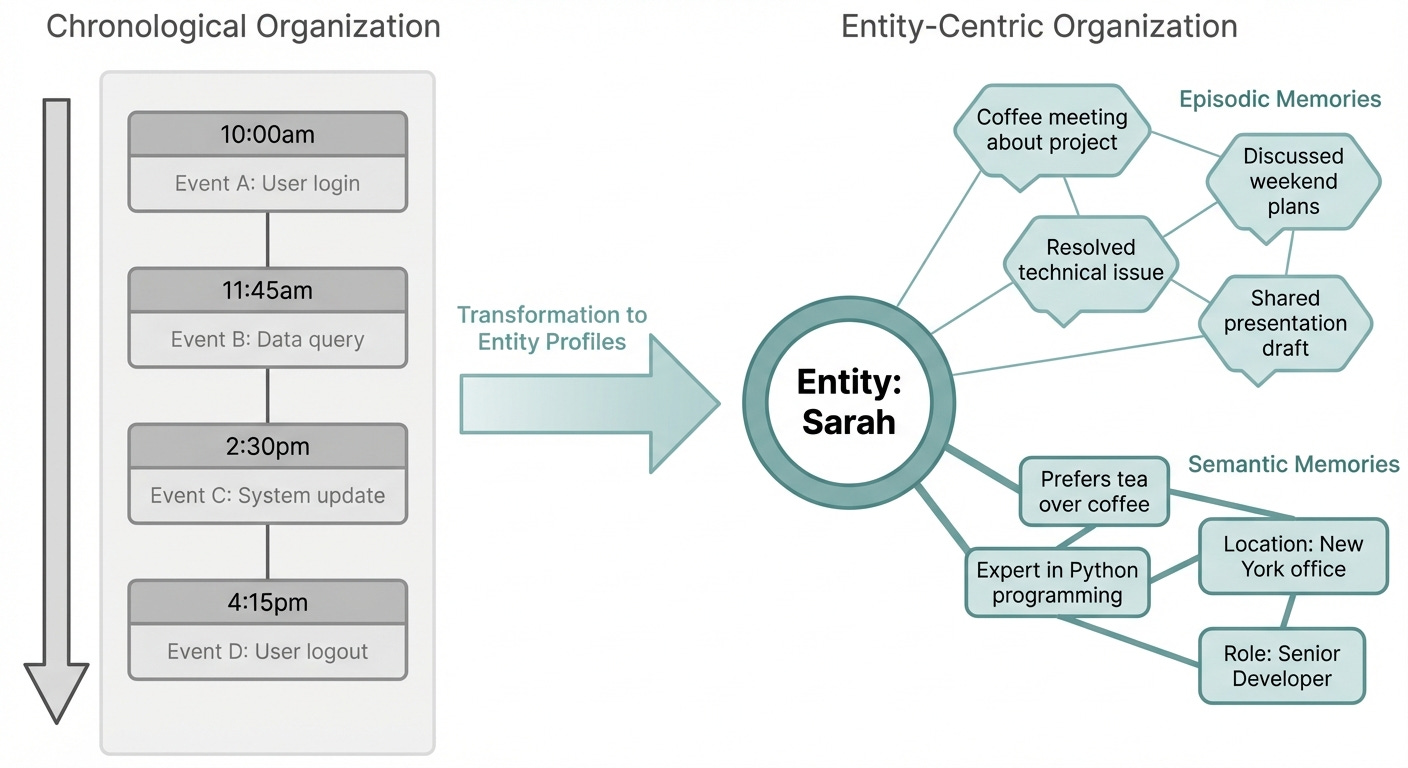 How do you actually remember things? You don’t store memories by timestamp. You organize them around people, objects, and places. You remember Sarah: her priorities, what she’s mentioned before, her role in your team, what she cares about. You organize memories around her as an entity, not around the moments when she appeared on your calendar.